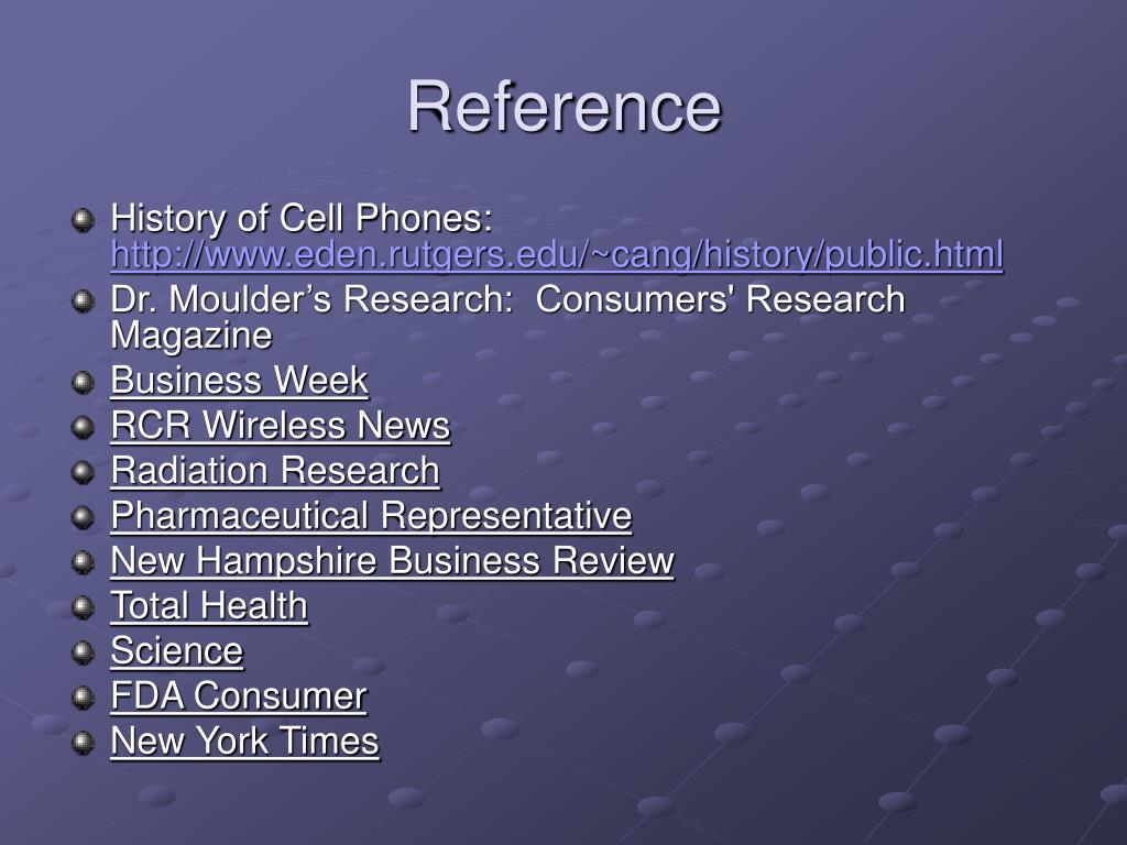 Reference • History of Cell Phones: http://www.eden.rutgers.edu/~cang/history/public.html • Dr. Moulder’s Research: Consumers' Research Magazine • Business Week • RCR Wireless News • Radiation Research • Pharmaceutical Representative • New Hampshire Business Review • Total Health • Science • FDA Consumer • New York Times