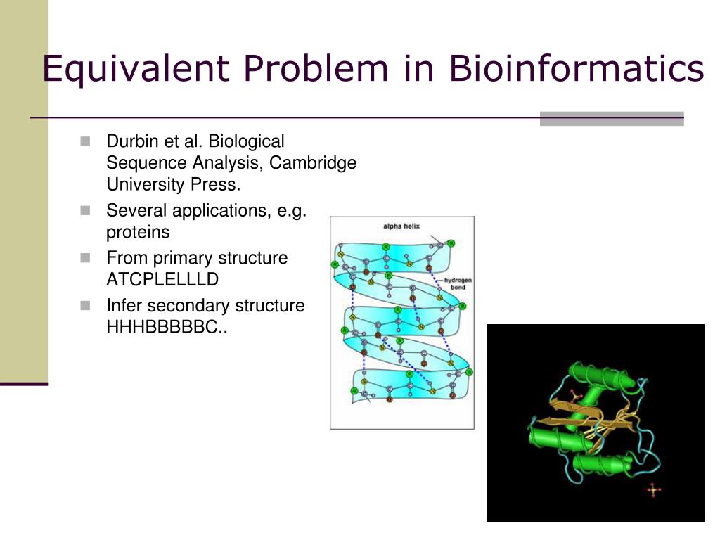 Equivalent Problem in Bioinformatics • Durbin et al. Biological Sequence Analysis, Cambridge University Press. • Several applications, e.g. proteins • From primary structure ATCPLELLLD • Infer secondary structure HHHBBBBBC..