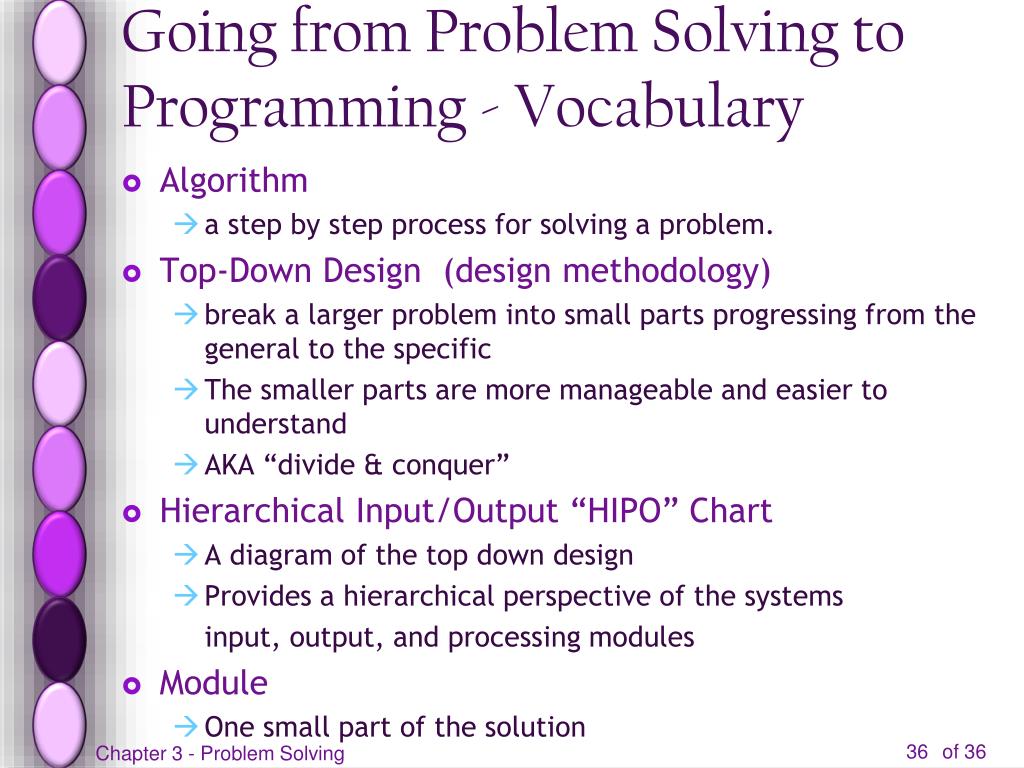 Going from Problem Solving to Programming - Vocabulary • Algorithm • a step by step process for solving a problem. • Top-Down Design (design methodology) • break a larger problem into small parts progressing from the general to the specific • The smaller parts are more manageable and easier to understand • AKA “divide & conquer” • Hierarchical Input/Output “HIPO” Chart • A diagram of the top down design • Provides a hierarchical perspective of the systems input, output, and processing modules • Module • One small part of the solution of 36