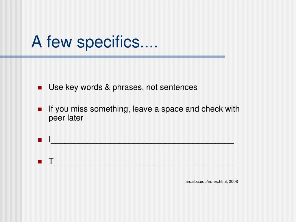 Use key words & phrases, not sentences If you miss something, leave a space and check with peer later I________________________________________ T________________________________________ arc.sbc.edu/notes.html, 2008 A few specifics....