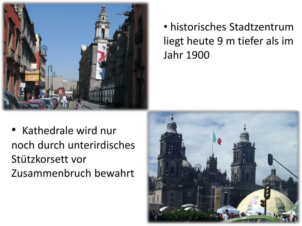 Geschichtliche und geographische Entwicklung • Gründung von Tenochtitlan auf Insel am westlichen Ufer des Sees durch Azteken • Dammsystem zur Regulierung der Wasserstände und Trennung des salzhaltigen Seewassers und Trinkwassers aus Zuläufen • Stadt wächst auf 100000 Einwohner