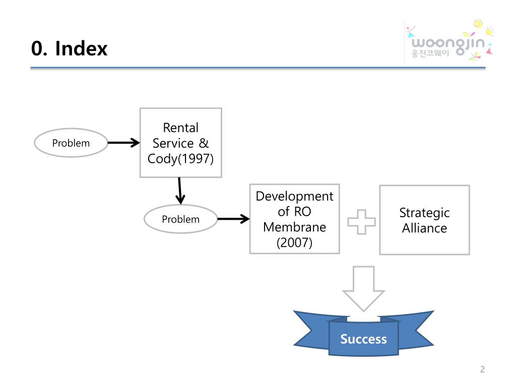 Woongjin Coway Water Purifier. CHOI, Jaehoon LEE, hyojung Kim, yejin. 0. Index. Rental Service & Cody(1997). Problem. Development of RO Membrane (2007). Strategic Alliance. Problem. Success. 1. Introduction – Company Overview. Establish the company Obtain Clean Mark