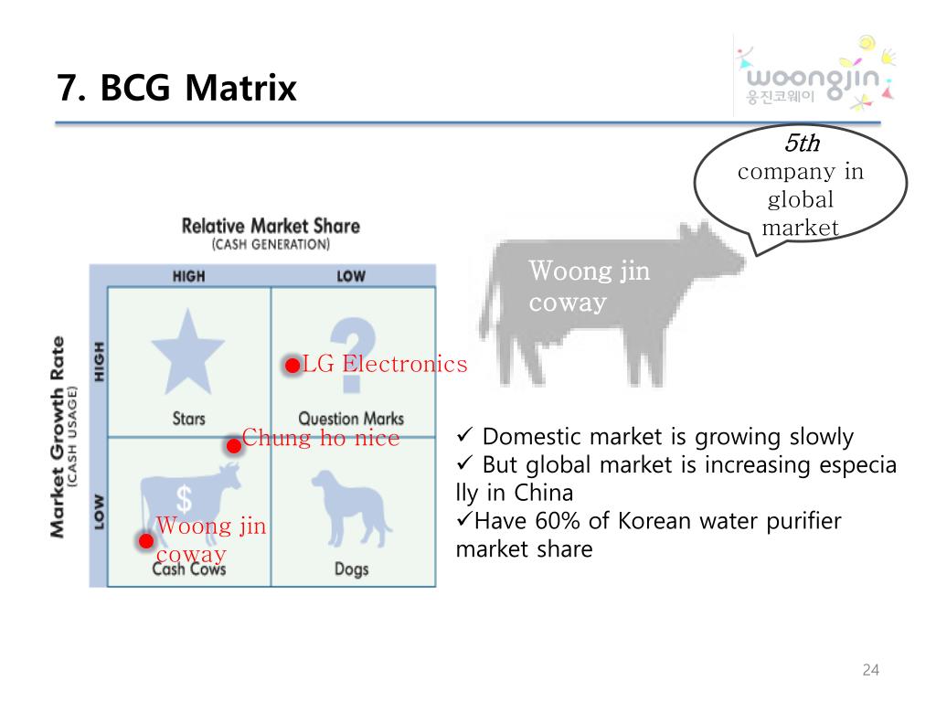 7. BCG Matrix 5th company in global market Woong jincoway Woong jin coway Chung ho nice LG Electronics • Domestic market is growing slowly • But global market is increasing especially in China • Have 60% of Korean water purifier market share