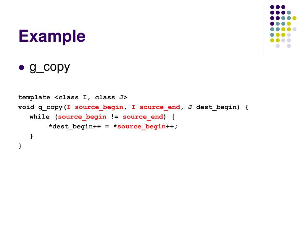 Example • g_copy template <class I, class J> void g_copy(I source_begin, I source_end, J dest_begin) { while (source_begin != source_end) { *dest_begin++ = *source_begin++; } }