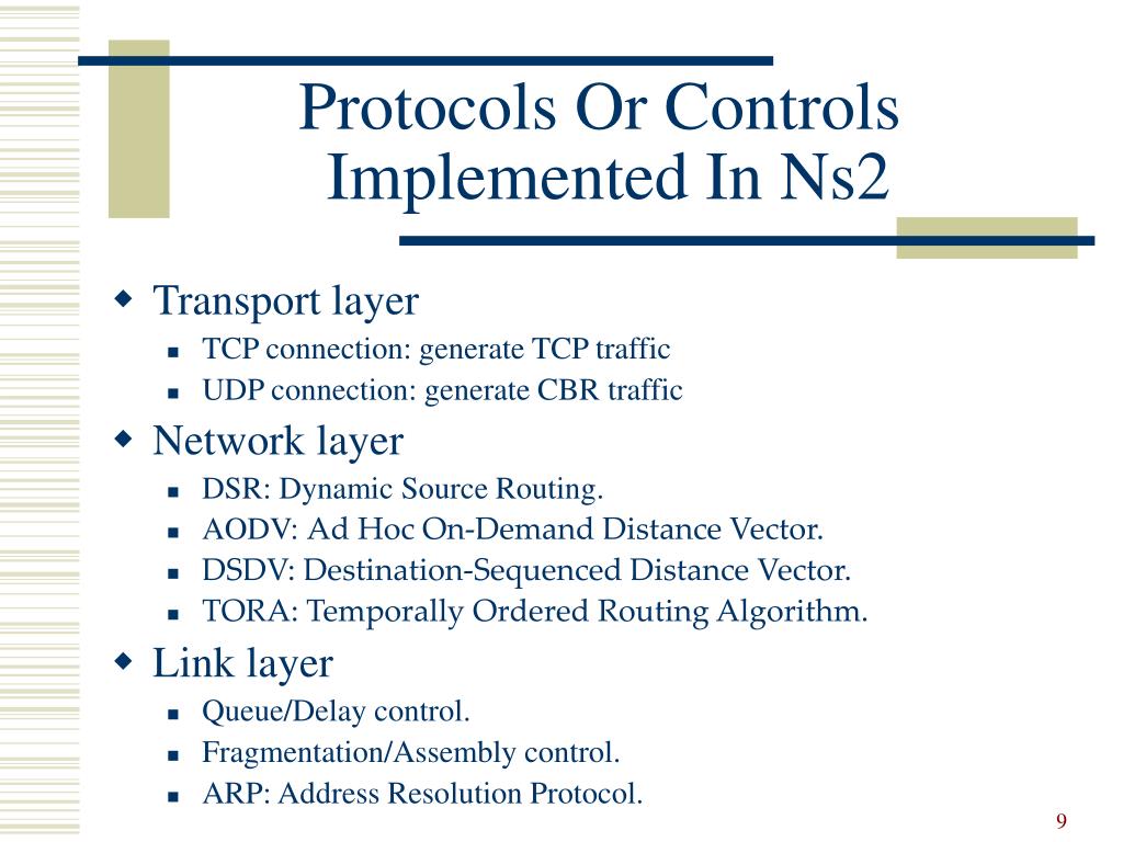 Protocols Or Controls Implemented In Ns2 • Transport layer • TCP connection: generate TCP traffic • UDP connection: generate CBR traffic • Network layer • DSR: Dynamic Source Routing. • AODV: Ad Hoc On-Demand Distance Vector. • DSDV: Destination-Sequenced Distance Vector. • TORA: Temporally Ordered Routing Algorithm. • Link layer • Queue/Delay control. • Fragmentation/Assembly control. • ARP: Address Resolution Protocol.