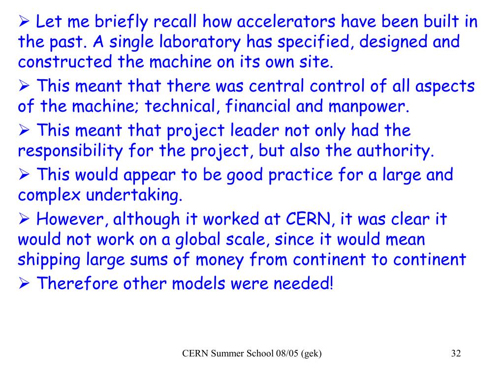 Let me briefly recall how accelerators have been built in the past. A single laboratory has specified, designed and constructed the machine on its own site. • This meant that there was central control of all aspects of the machine; technical, financial and manpower. • This meant that project leader not only had the responsibility for the project, but also the authority. • This would appear to be good practice for a large and complex undertaking. • However, although it worked at CERN, it was clear it would not work on a global scale, since it would mean shipping large sums of money from continent to continent • Therefore other models were needed! CERN Summer School 08/05 (gek)
