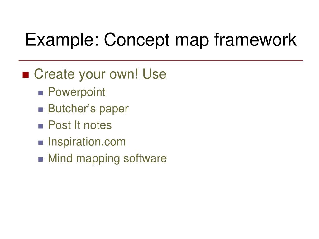 Example: Concept map framework • Create your own! Use • Powerpoint • Butcher’s paper • Post It notes • Inspiration.com • Mind mapping software