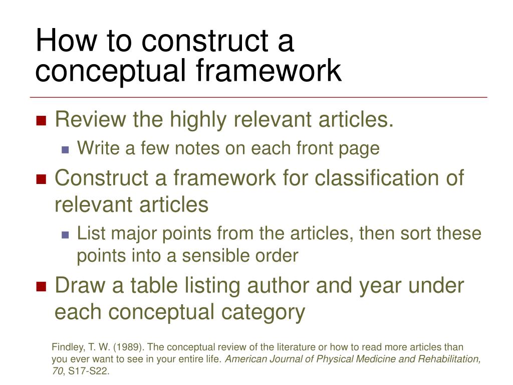 How to construct a conceptual framework • Review the highly relevant articles. • Write a few notes on each front page • Construct a framework for classification of relevant articles • List major points from the articles, then sort these points into a sensible order • Draw a table listing author and year under each conceptual category Findley, T. W. (1989). The conceptual review of the literature or how to read more articles than you ever want to see in your entire life. American Journal of Physical Medicine and Rehabilitation, 70, S17-S22.
