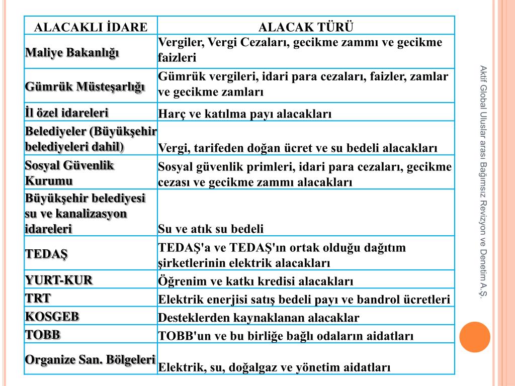 1. TAHSİLATIN HIZLANDIRILMASINA (ÖDEMELERİN KOLAYLAŞTIRILMASINA) İLİŞKİN HÜKÜMLER • Hangi Borçlar Af Kapsamındadır? Aktif Global Uluslar arası Bağımsız Revizyon ve Denetim A.Ş.
