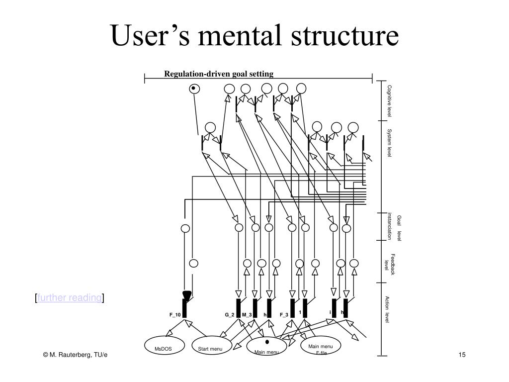 User’s mental structure Regulation-driven goal setting Cognitive level System level Goal instanciation level Feedback level [further reading] Action level 1 i h F_10 G_2 M_3 h F_3 Main menu MsDOS Start menu Main menu F-file