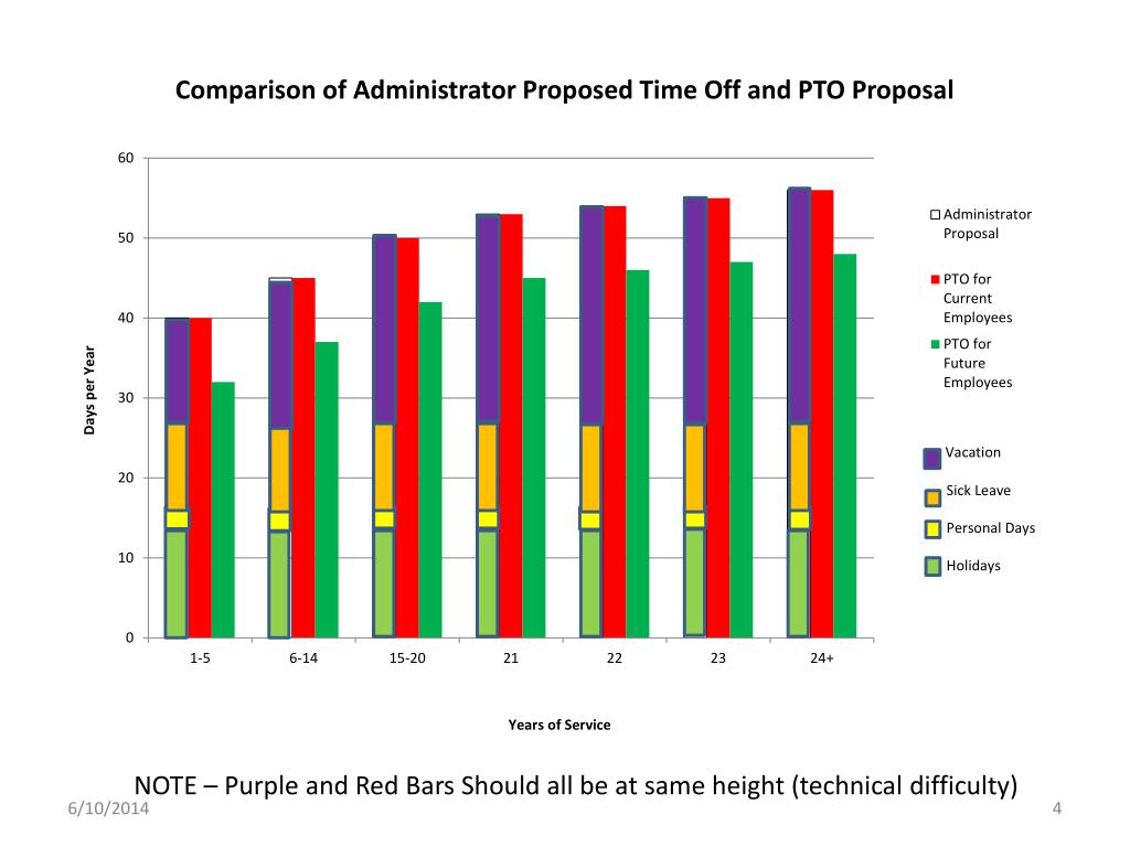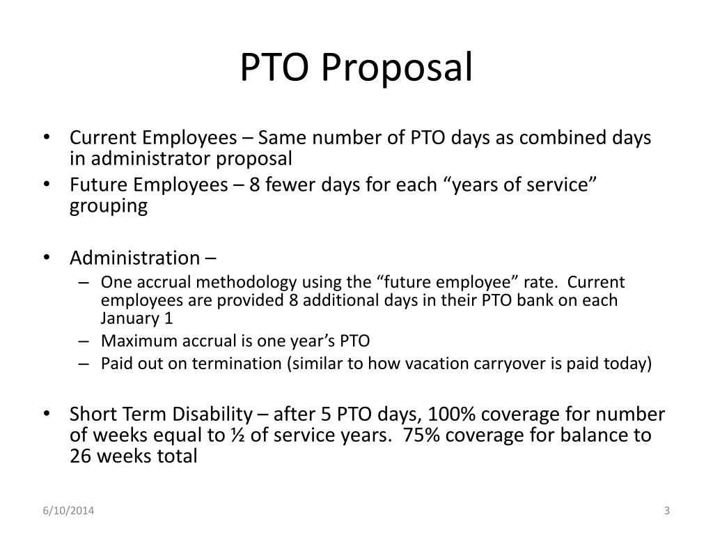 PTO Proposal • Current Employees – Same number of PTO days as combined days in administrator proposal • Future Employees – 8 fewer days for each “years of service” grouping • Administration – • One accrual methodology using the “future employee” rate. Current employees are provided 8 additional days in their PTO bank on each January 1 • Maximum accrual is one year’s PTO • Paid out on termination (similar to how vacation carryover is paid today) • Short Term Disability – after 5 PTO days, 100% coverage for number of weeks equal to ½ of service years. 75% coverage for balance to 26 weeks total