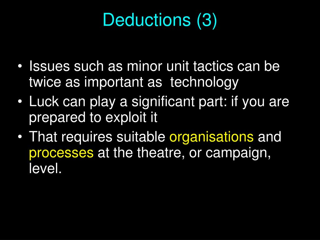 Deductions (3) • Issues such as minor unit tactics can be twice as important as technology • Luck can play a significant part: if you are prepared to exploit it • That requires suitable organisations and processes at the theatre, or campaign, level.