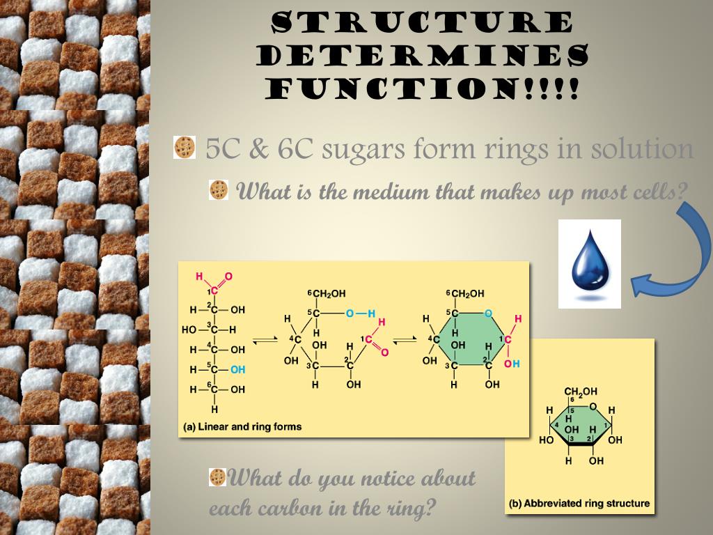 Structure determines function!!!! 5C & 6C sugars form rings in solution What is the medium that makes up most cells? What do you notice abouteach carbon in the ring?
