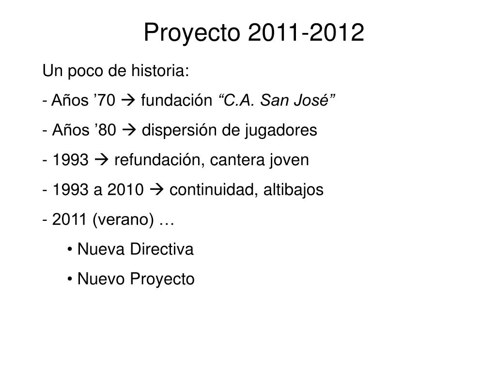Proyecto 2011-2012 • Un poco de historia: • Años ’70 fundación “C.A. San José” • Años ’80 dispersión de jugadores • 1993 refundación, cantera joven • 1993 a 2010 continuidad, altibajos • 2011 (verano) … • Nueva Directiva • Nuevo Proyecto