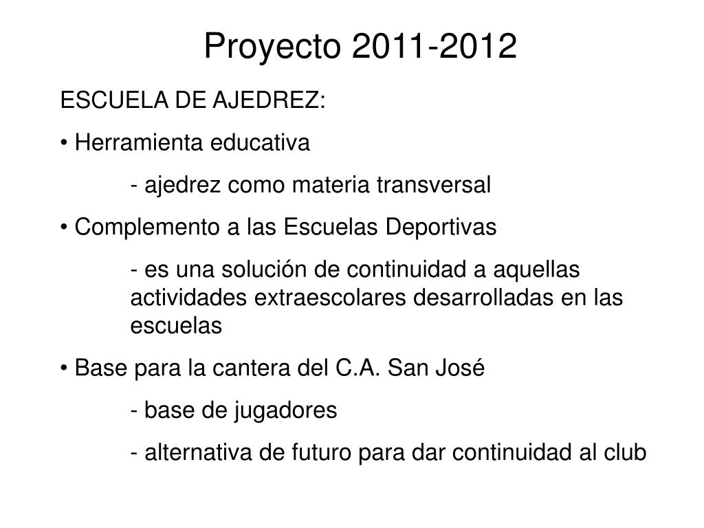Proyecto 2011-2012 • ESCUELA DE AJEDREZ: • Herramienta educativa • - ajedrez como materia transversal • Complemento a las Escuelas Deportivas • - es una solución de continuidad a aquellas actividades extraescolares desarrolladas en las escuelas • Base para la cantera del C.A. San José • - base de jugadores • - alternativa de futuro para dar continuidad al club