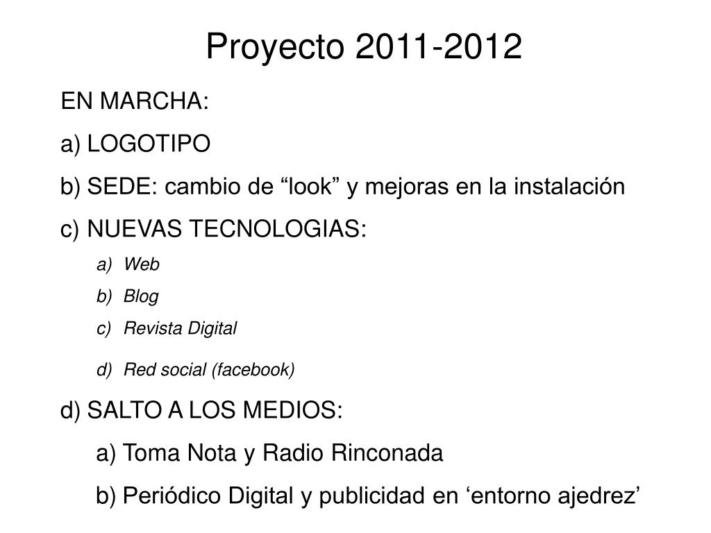 Proyecto 2011-2012 • EN MARCHA: • LOGOTIPO • SEDE: cambio de “look” y mejoras en la instalación • NUEVAS TECNOLOGIAS: • Web • Blog • Revista Digital • Red social (facebook) • SALTO A LOS MEDIOS: • Toma Nota y Radio Rinconada • Periódico Digital y publicidad en ‘entorno ajedrez’