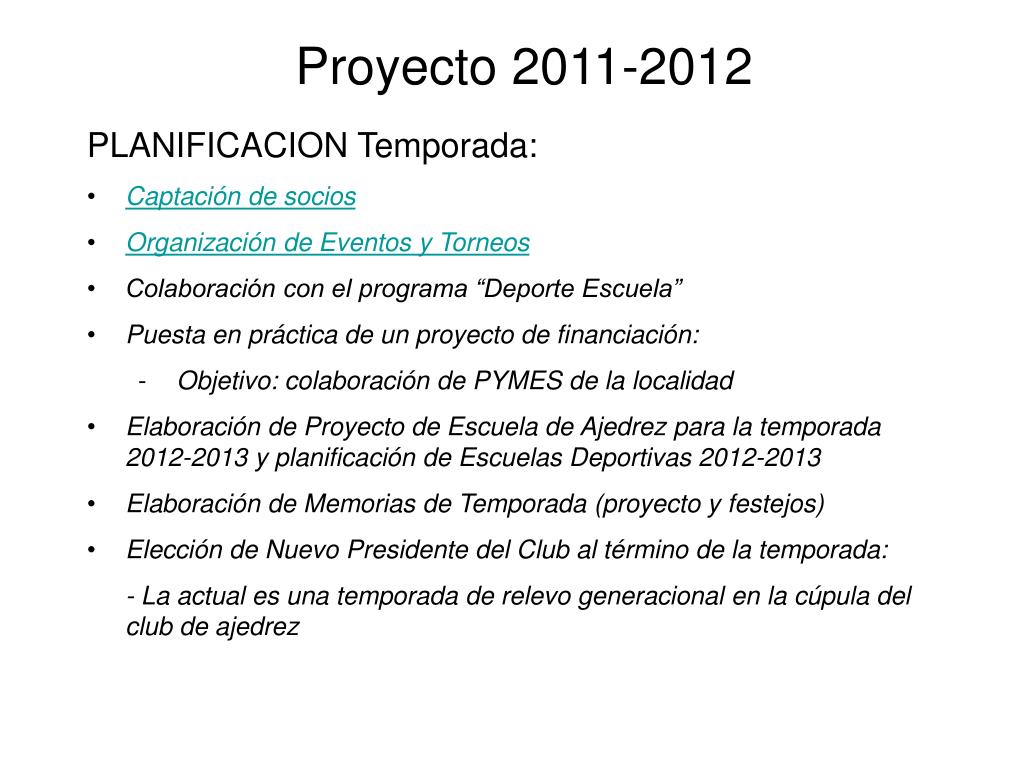 Proyecto 2011-2012 • PLANIFICACION Temporada: • Captación de socios • Organización de Eventos y Torneos • Colaboración con el programa “Deporte Escuela” • Puesta en práctica de un proyecto de financiación: • Objetivo: colaboración de PYMES de la localidad • Elaboración de Proyecto de Escuela de Ajedrez para la temporada 2012-2013 y planificación de Escuelas Deportivas 2012-2013 • Elaboración de Memorias de Temporada (proyecto y festejos) • Elección de Nuevo Presidente del Club al término de la temporada: • - La actual es una temporada de relevo generacional en la cúpula del club de ajedrez