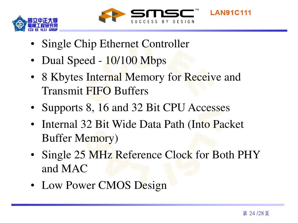 Single Chip Ethernet Controller • Dual Speed - 10/100 Mbps • 8 Kbytes Internal Memory for Receive and Transmit FIFO Buffers • Supports 8, 16 and 32 Bit CPU Accesses • Internal 32 Bit Wide Data Path (Into Packet Buffer Memory) • Single 25 MHz Reference Clock for Both PHY and MAC • Low Power CMOS Design