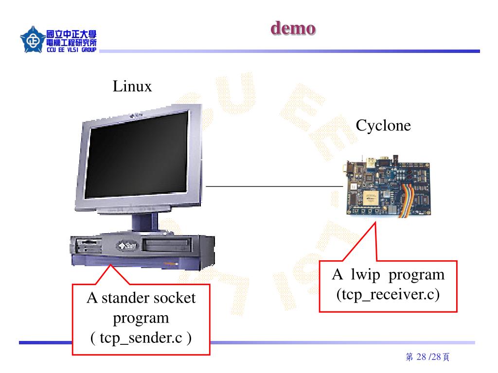 demo Linux Cyclone A lwip program (tcp_receiver.c) A stander socket program ( tcp_sender.c )