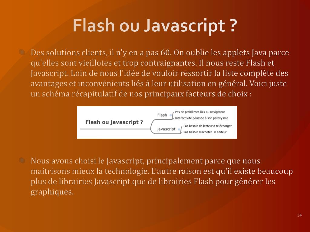 Flash ou Javascript ? • Des solutions clients, il n'y en a pas 60. On oublie les applets Java parce qu'elles sont vieillotes et trop contraignantes. Il nous reste Flash et Javascript. Loin de nous l'idée de vouloir ressortir la liste complète des avantages et inconvénients liés à leur utilisation en général. Voici juste un schéma récapitulatif de nos principaux facteurs de choix : • Nous avons choisi le Javascript, principalement parce que nous maitrisons mieux la technologie. L'autre raison est qu'il existe beaucoup plus de librairies Javascript que de librairies Flash pour générer les graphiques.