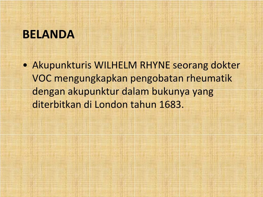 BELANDA • Akupunkturis WILHELM RHYNE seorang dokter VOC mengungkapkan pengobatan rheumatik dengan akupunktur dalam bukunya yang diterbitkan di London tahun 1683.