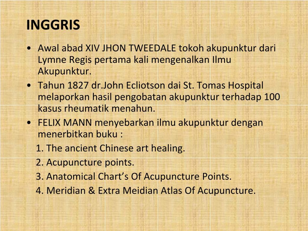 INGGRIS • Awal abad XIV JHON TWEEDALE tokoh akupunktur dari Lymne Regis pertama kali mengenalkan Ilmu Akupunktur. • Tahun 1827 dr.John Ecliotson dai St. Tomas Hospital melaporkan hasil pengobatan akupunktur terhadap 100 kasus rheumatik menahun. • FELIX MANN menyebarkan ilmu akupunktur dengan menerbitkan buku : 1. The ancient Chinese art healing. 2. Acupuncture points. 3. Anatomical Chart’s Of Acupuncture Points. 4. Meridian & Extra Meidian Atlas Of Acupuncture.