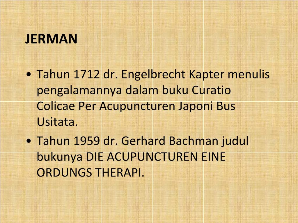 JERMAN • Tahun 1712 dr. Engelbrecht Kapter menulis pengalamannya dalam buku Curatio Colicae Per Acupuncturen Japoni Bus Usitata. • Tahun 1959 dr. Gerhard Bachman judul bukunya DIE ACUPUNCTUREN EINE ORDUNGS THERAPI.