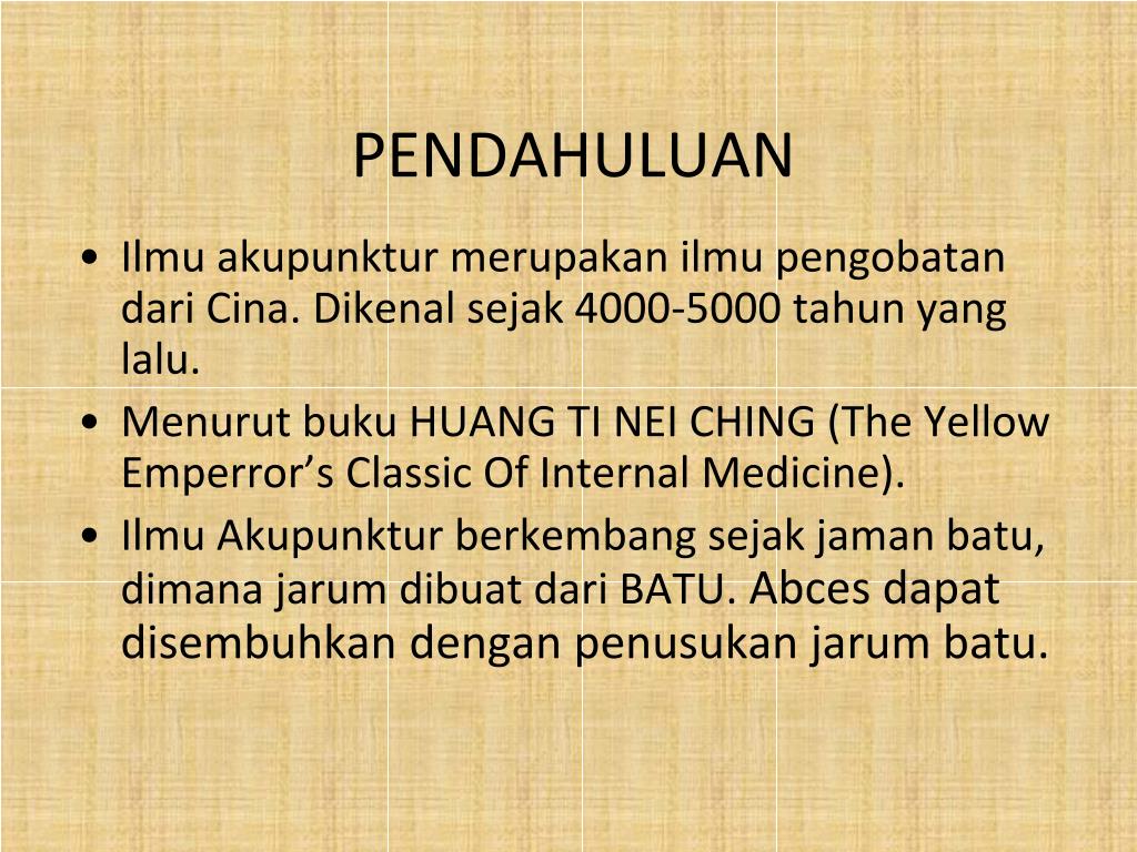 PENDAHULUAN • Ilmu akupunktur merupakan ilmu pengobatan dari Cina. Dikenal sejak 4000-5000 tahun yang lalu. • Menurut buku HUANG TI NEI CHING (The Yellow Emperror’s Classic Of Internal Medicine). • Ilmu Akupunktur berkembang sejak jaman batu, dimana jarum dibuat dari BATU. Abces dapat disembuhkan dengan penusukan jarum batu.