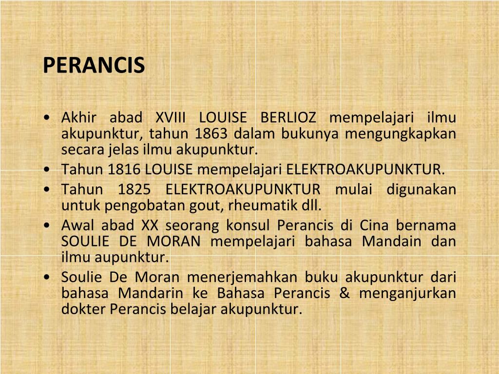 PERANCIS • Akhir abad XVIII LOUISE BERLIOZ mempelajari ilmu akupunktur, tahun 1863 dalam bukunya mengungkapkan secara jelas ilmu akupunktur. • Tahun 1816 LOUISE mempelajari ELEKTROAKUPUNKTUR. • Tahun 1825 ELEKTROAKUPUNKTUR mulai digunakan untuk pengobatan gout, rheumatik dll. • Awal abad XX seorang konsul Perancis di Cina bernama SOULIE DE MORAN mempelajari bahasa Mandain dan ilmu aupunktur. • Soulie De Moran menerjemahkan buku akupunktur dari bahasa Mandarin ke Bahasa Perancis & menganjurkan dokter Perancis belajar akupunktur.