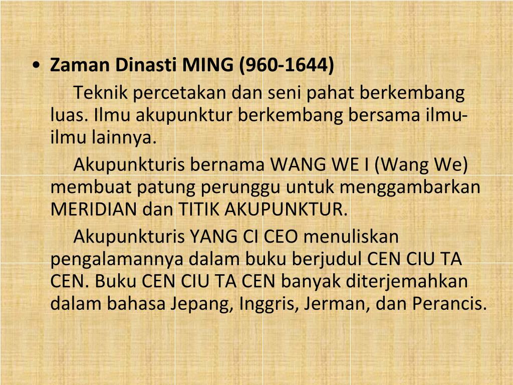 Zaman Dinasti MING (960-1644) Teknik percetakan dan seni pahat berkembang luas. Ilmu akupunktur berkembang bersama ilmu-ilmu lainnya. Akupunkturis bernama WANG WE I (Wang We) membuat patung perunggu untuk menggambarkan MERIDIAN dan TITIK AKUPUNKTUR. Akupunkturis YANG CI CEO menuliskan pengalamannya dalam buku berjudul CEN CIU TA CEN. Buku CEN CIU TA CEN banyak diterjemahkan dalam bahasa Jepang, Inggris, Jerman, dan Perancis.