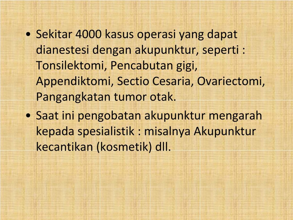 Sekitar 4000 kasus operasi yang dapat dianestesi dengan akupunktur, seperti : Tonsilektomi, Pencabutan gigi, Appendiktomi, Sectio Cesaria, Ovariectomi, Pangangkatan tumor otak. • Saat ini pengobatan akupunktur mengarah kepada spesialistik : misalnya Akupunktur kecantikan (kosmetik) dll.