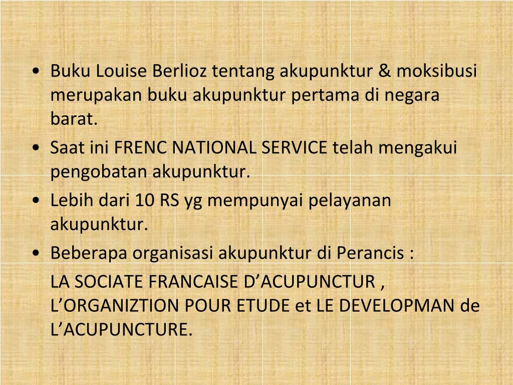Buku Louise Berlioz tentang akupunktur & moksibusi merupakan buku akupunktur pertama di negara barat. • Saat ini FRENC NATIONAL SERVICE telah mengakui pengobatan akupunktur. • Lebih dari 10 RS yg mempunyai pelayanan akupunktur. • Beberapa organisasi akupunktur di Perancis : LA SOCIATE FRANCAISE D’ACUPUNCTUR , L’ORGANIZTION POUR ETUDE et LE DEVELOPMAN de L’ACUPUNCTURE.