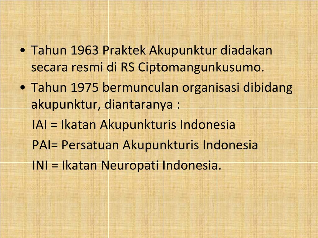 Tahun 1963 Praktek Akupunktur diadakan secara resmi di RS Ciptomangunkusumo. • Tahun 1975 bermunculan organisasi dibidang akupunktur, diantaranya : IAI = Ikatan Akupunkturis Indonesia PAI= Persatuan Akupunkturis Indonesia INI = Ikatan Neuropati Indonesia.