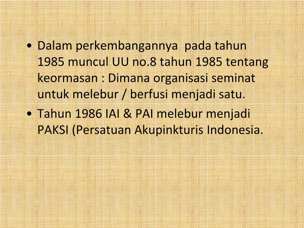 Dalam perkembangannya pada tahun 1985 muncul UU no.8 tahun 1985 tentang keormasan : Dimana organisasi seminat untuk melebur / berfusi menjadi satu. • Tahun 1986 IAI & PAI melebur menjadi PAKSI (Persatuan Akupinkturis Indonesia.