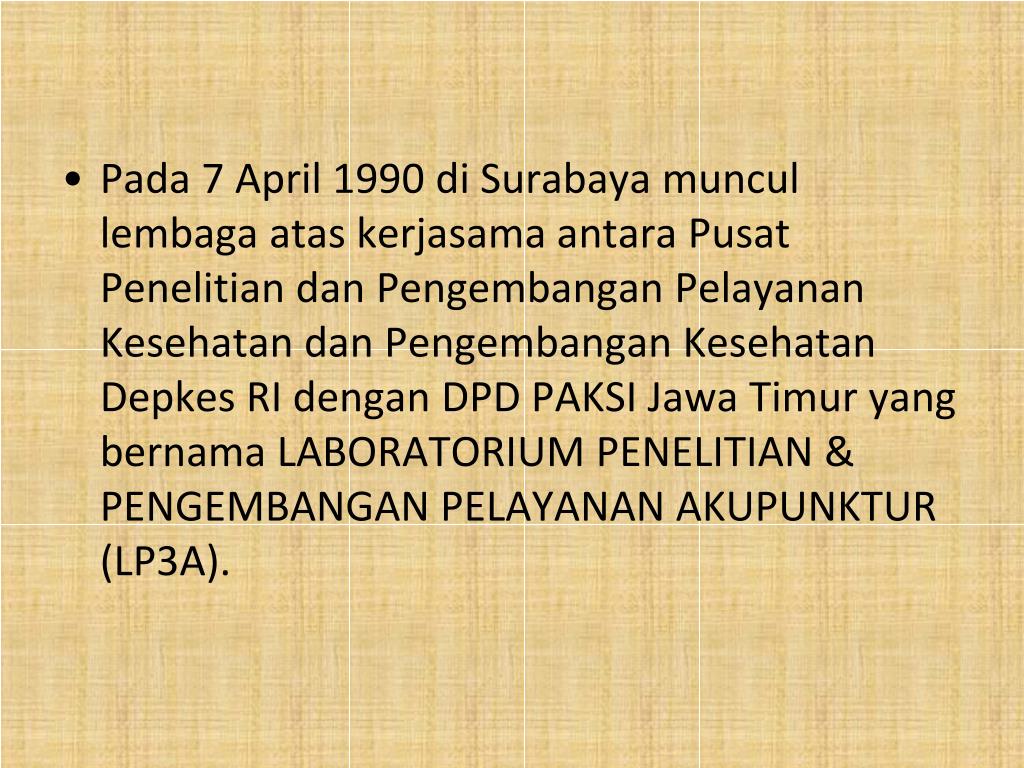 Pada 7 April 1990 di Surabaya muncul lembaga atas kerjasama antara Pusat Penelitian dan Pengembangan Pelayanan Kesehatan dan Pengembangan Kesehatan Depkes RI dengan DPD PAKSI Jawa Timur yang bernama LABORATORIUM PENELITIAN & PENGEMBANGAN PELAYANAN AKUPUNKTUR (LP3A).