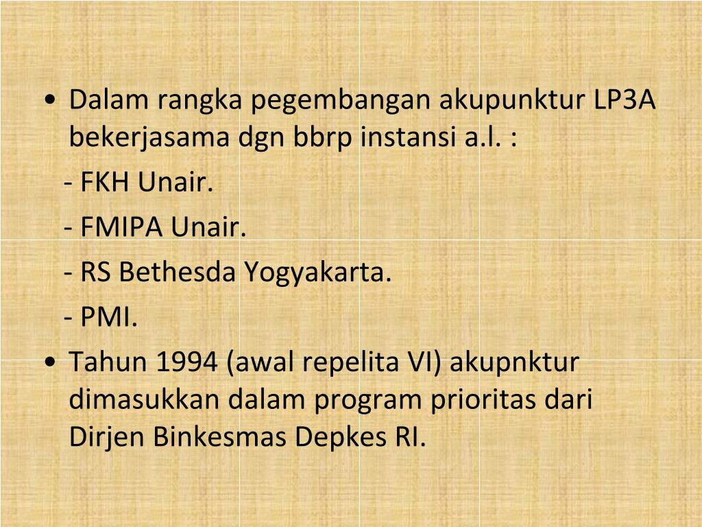 Dalam rangka pegembangan akupunktur LP3A bekerjasama dgn bbrp instansi a.l. : - FKH Unair. - FMIPA Unair. - RS Bethesda Yogyakarta. - PMI. • Tahun 1994 (awal repelita VI) akupnktur dimasukkan dalam program prioritas dari Dirjen Binkesmas Depkes RI.