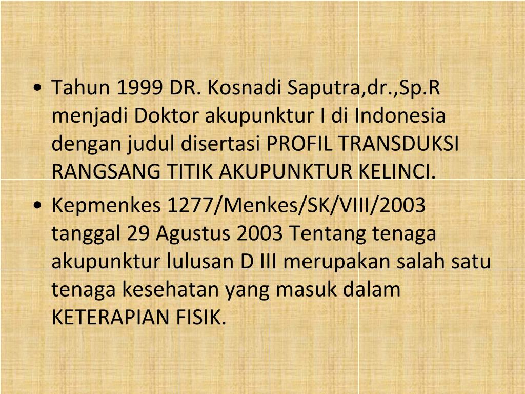 Tahun 1999 DR. Kosnadi Saputra,dr.,Sp.R menjadi Doktor akupunktur I di Indonesia dengan judul disertasi PROFIL TRANSDUKSI RANGSANG TITIK AKUPUNKTUR KELINCI. • Kepmenkes 1277/Menkes/SK/VIII/2003 tanggal 29 Agustus 2003 Tentang tenaga akupunktur lulusan D III merupakan salah satu tenaga kesehatan yang masuk dalam KETERAPIAN FISIK.