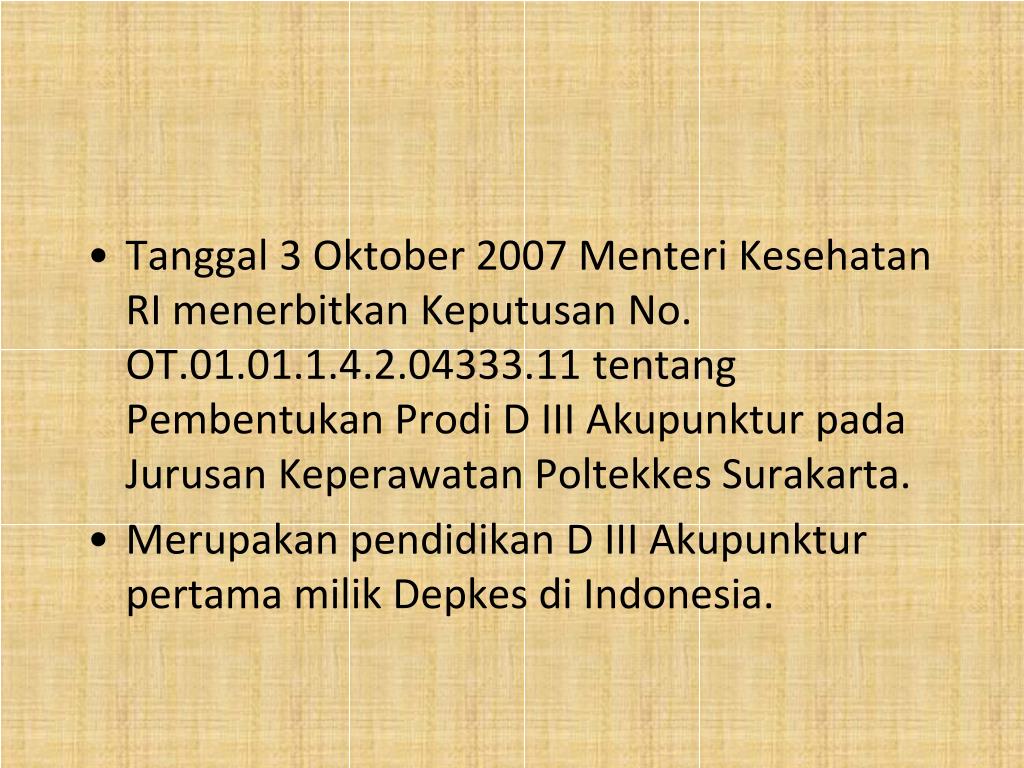 Tanggal 3 Oktober 2007 Menteri Kesehatan RI menerbitkan Keputusan No. OT.01.01.1.4.2.04333.11 tentang Pembentukan Prodi D III Akupunktur pada Jurusan Keperawatan Poltekkes Surakarta. • Merupakan pendidikan D III Akupunktur pertama milik Depkes di Indonesia.