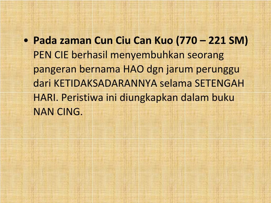 Pada zaman Cun Ciu Can Kuo (770 – 221 SM) PEN CIE berhasil menyembuhkan seorang pangeran bernama HAO dgn jarum perunggu dari KETIDAKSADARANNYA selama SETENGAH HARI. Peristiwa ini diungkapkan dalam buku NAN CING.