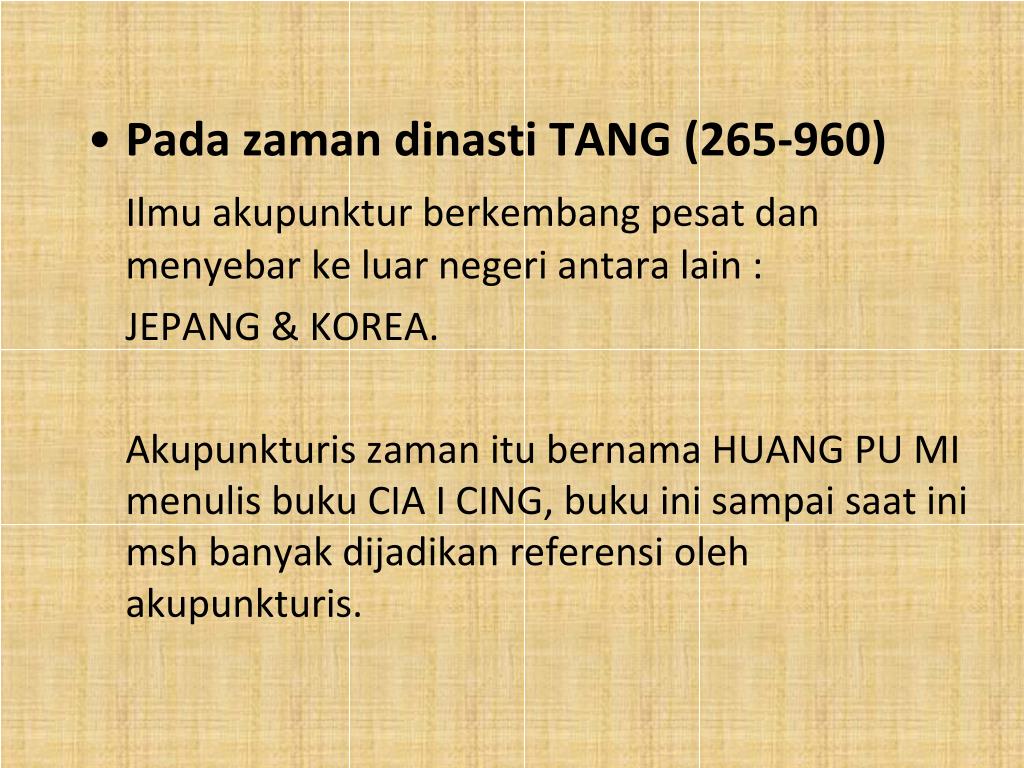Pada zaman dinasti TANG (265-960) Ilmu akupunktur berkembang pesat dan menyebar ke luar negeri antara lain : JEPANG & KOREA. Akupunkturis zaman itu bernama HUANG PU MI menulis buku CIA I CING, buku ini sampai saat ini msh banyak dijadikan referensi oleh akupunkturis.