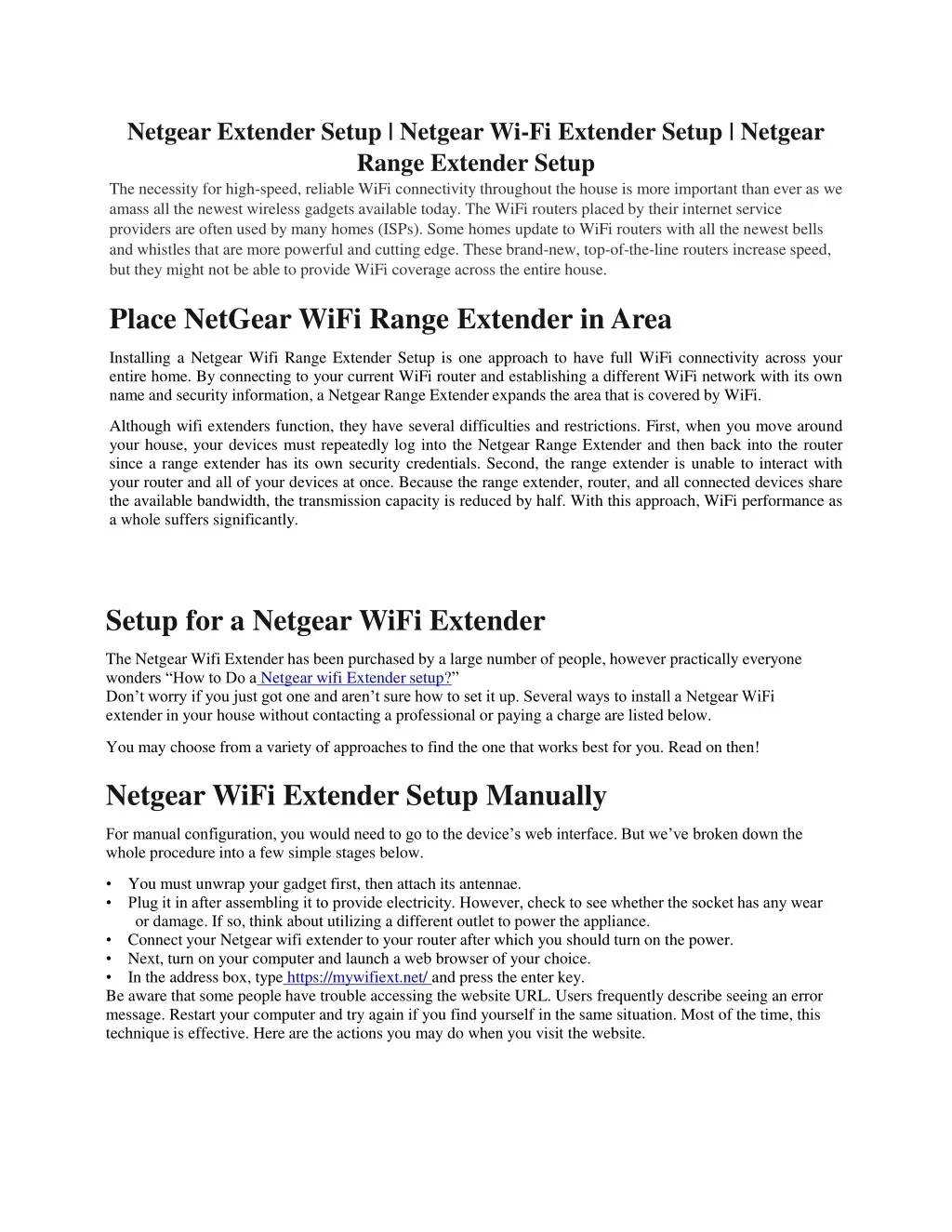Netgear Extender Setup | Netgear Wi-Fi Extender Setup | Netgear Range Extender Setup The necessity for high-speed, reliable WiFi connectivity throughout the house is more important than ever as we amass all the newest wireless gadgets available today. The WiFi routers placed by their internet service providers are often used by many homes (ISPs). Some homes update to WiFi routers with all the newest bells and whistles that are more powerful and cutting edge. These brand-new, top-of-the-line routers increase speed, but they might not be able to provide WiFi coverage across the entire house. Place NetGear WiFi Range Extender in Area Installing a Netgear Wifi Range Extender Setup is one approach to have full WiFi connectivity across your entire home. By connecting to your current WiFi router and establishing a different WiFi network with its own name and security information, a Netgear Range Extender expands the area that is covered by WiFi. Although wifi extenders function, they have several difficulties and restrictions. First, when you move around your house, your devices must repeatedly log into the Netgear Range Extender and then back into the router since a range extender has its own security credentials. Second, the range extender is unable to interact with your router and all of your devices at once. Because the range extender, router, and all connected devices share the available bandwidth, the transmission capacity is reduced by half. With this approach, WiFi performance as a whole suffers significantly. Setup for a Netgear WiFi Extender The Netgear Wifi Extender has been purchased by a large number of people, however practically everyone wonders “How to Do aNetgear wifi Extender setup?” Don’t worry if you just got one and aren’t sure how to set it up. Several ways to install a Netgear WiFi extender in your house without contacting a professional or paying a charge are listed below. You may choose from a variety of approaches to find the one that works best for you. Read on then! Netgear WiFi Extender Setup Manually For manual configuration, you would need to go to the device’s web interface. But we’ve broken down the whole procedure into a few simple stages below. • You must unwrap your gadget first, then attach its antennae. • Plug it in after assembling it to provide electricity. However, check to see whether the socket has any wear or damage. If so, think about utilizing a different outlet to power the appliance. • Connect your Netgear wifi extender to your router after which you should turn on the power. • Next, turn on your computer and launch a web browser of your choice. • In the address box, typehttps://mywifiext.net/and press the enter key. Be aware that some people have trouble accessing the website URL. Users frequently describe seeing an error message. Restart your computer and try again if you find yourself in the same situation. Most of the time, this technique is effective. Here are the actions you may do when you visit the website.