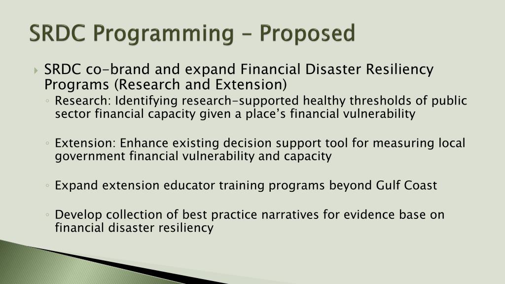 SRDC Programming – Proposed • SRDC co-brand and expand Financial Disaster Resiliency Programs (Research and Extension) • Research: Identifying research-supported healthy thresholds of public sector financial capacity given a place’s financial vulnerability • Extension: Enhance existing decision support tool for measuring local government financial vulnerability and capacity • Expand extension educator training programs beyond Gulf Coast • Develop collection of best practice narratives for evidence base on financial disaster resiliency