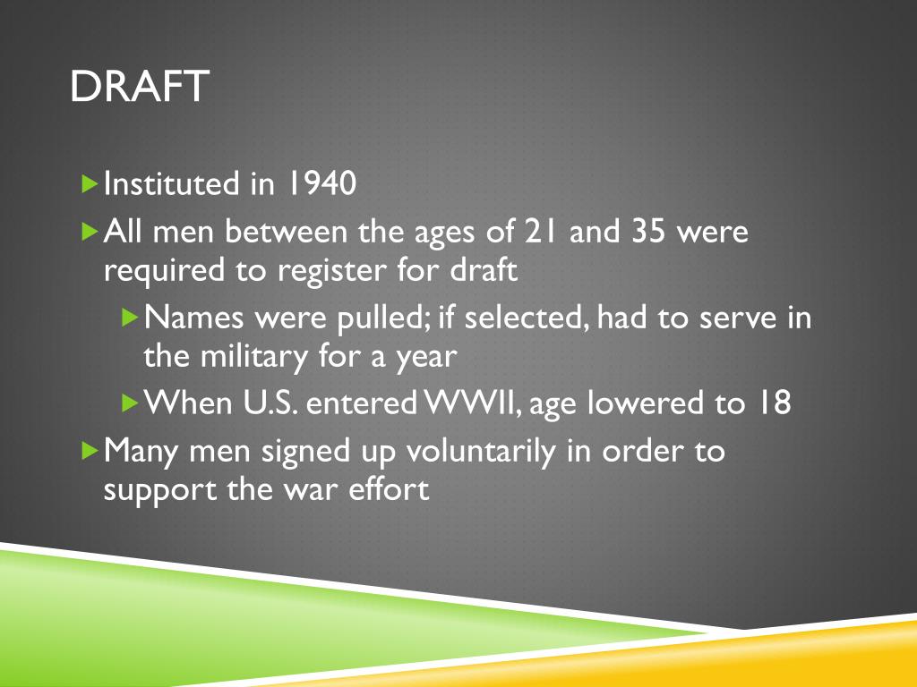 Draft • Instituted in 1940 • All men between the ages of 21 and 35 were required to register for draft • Names were pulled; if selected, had to serve in the military for a year • When U.S. entered WWII, age lowered to 18 • Many men signed up voluntarily in order to support the war effort