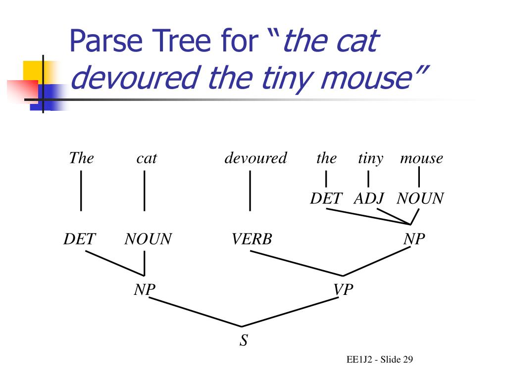 The cat devoured the tiny mouse DET ADJ NOUN DET NOUN VERB NP NP VP S Parse Tree for “the cat devoured the tiny mouse”