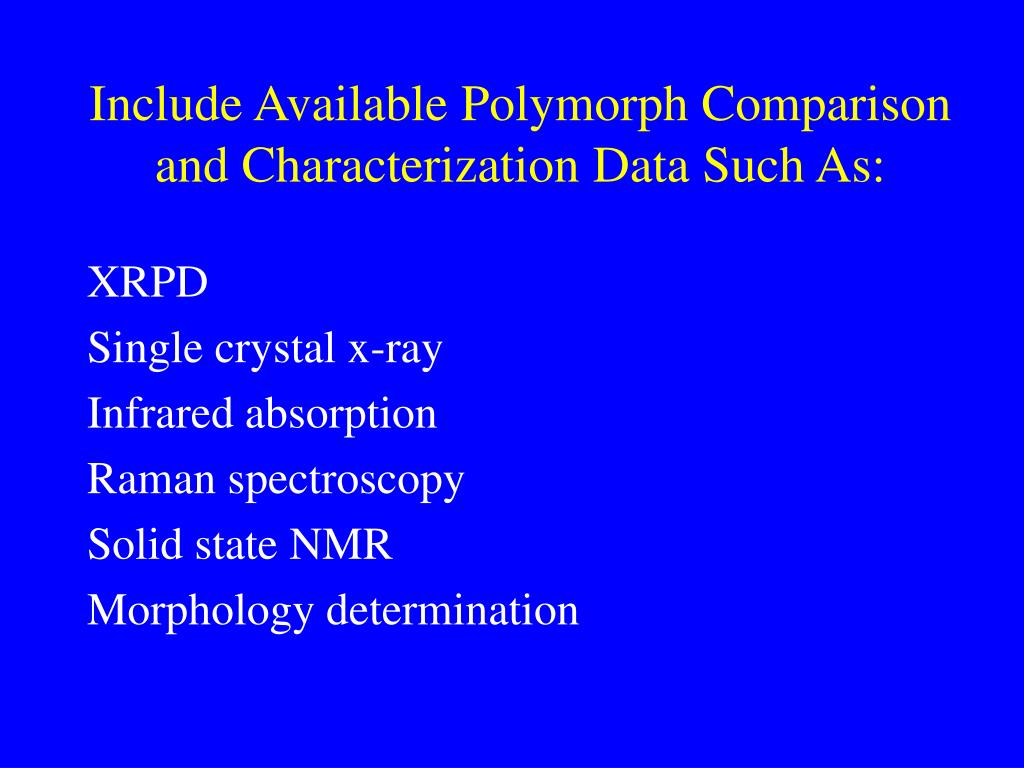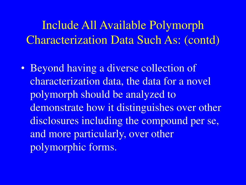 Include All Available Polymorph Characterization Data Such As: (contd) • Beyond having a diverse collection of characterization data, the data for a novel polymorph should be analyzed to demonstrate how it distinguishes over other disclosures including the compound per se, and more particularly, over other polymorphic forms.