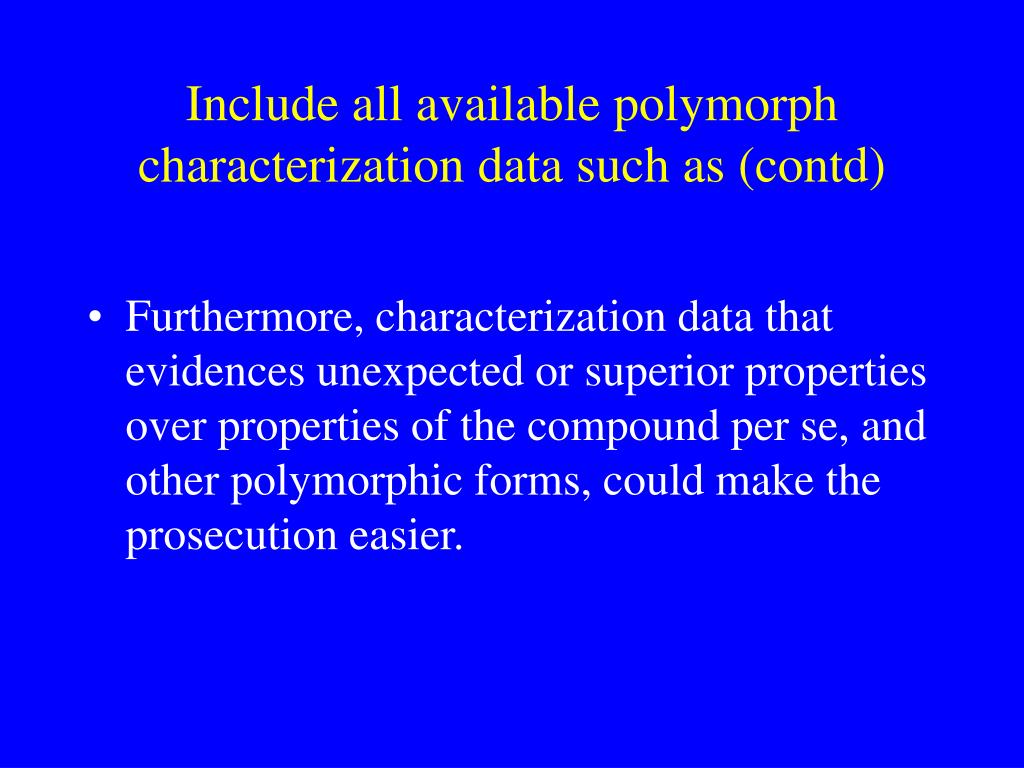 Include all available polymorph characterization data such as (contd) • Furthermore, characterization data that evidences unexpected or superior properties over properties of the compound per se, and other polymorphic forms, could make the prosecution easier.