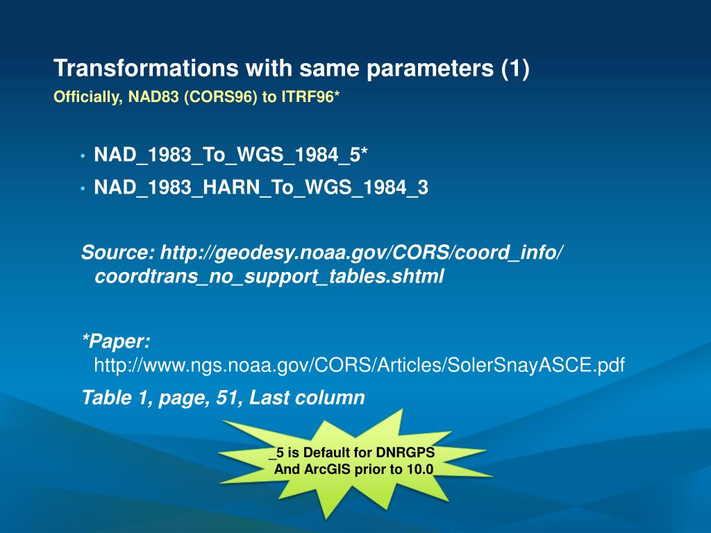 Transformations with same parameters (1) Officially, NAD83 (CORS96) to ITRF96* NAD_1983_To_WGS_1984_5* NAD_1983_HARN_To_WGS_1984_3 Source: http://geodesy.noaa.gov/CORS/coord_info/ coordtrans_no_support_tables.shtml *Paper: http://www.ngs.noaa.gov/CORS/Articles/SolerSnayASCE.pdf Table 1, page, 51, Last column _5 is Default for DNRGPS And ArcGIS prior to 10.0