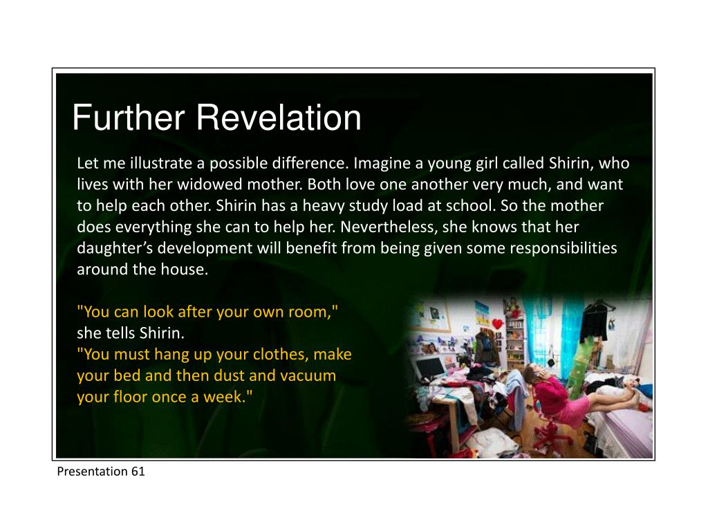 Further Revelation Let me illustrate a possible difference. Imagine a young girl called Shirin, who lives with her widowed mother. Both love one another very much, and want to help each other. Shirin has a heavy study load at school. So the mother does everything she can to help her. Nevertheless, she knows that her daughter’s development will benefit from being given some responsibilities around the house. "You can look after your own room," she tells Shirin. "You must hang up your clothes, make your bed and then dust and vacuum your floor once a week." Presentation 61