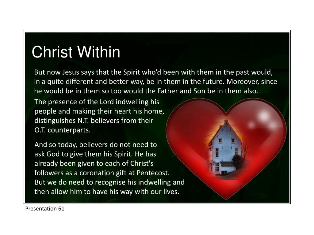 Christ Within But now Jesus says that the Spirit who’d been with them in the past would, in a quite different and better way, be in them in the future. Moreover, since he would be in them so too would the Father and Son be in them also. The presence of the Lord indwelling his people and making their heart his home, distinguishes N.T. believers from their O.T. counterparts. And so today, believers do not need to ask God to give them his Spirit. He has already been given to each of Christ's followers as a coronation gift at Pentecost. But we do need to recognise his indwelling and then allow him to have his way with our lives. a Presentation 61
