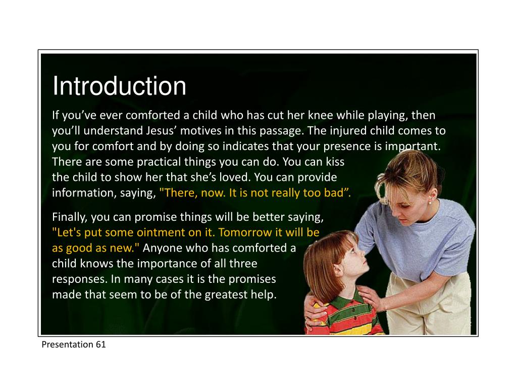 Introduction If you’ve ever comforted a child who has cut her knee while playing, then you’ll understand Jesus’ motives in this passage. The injured child comes to you for comfort and by doing so indicates that your presence is important. There are some practical things you can do. You can kiss the child to show her that she’s loved. You can provide information, saying, "There, now. It is not really too bad”. Finally, you can promise things will be better saying, "Let's put some ointment on it. Tomorrow it will be as good as new." Anyone who has comforted a child knows the importance of all three responses. In many cases it is the promises made that seem to be of the greatest help. Presentation 61